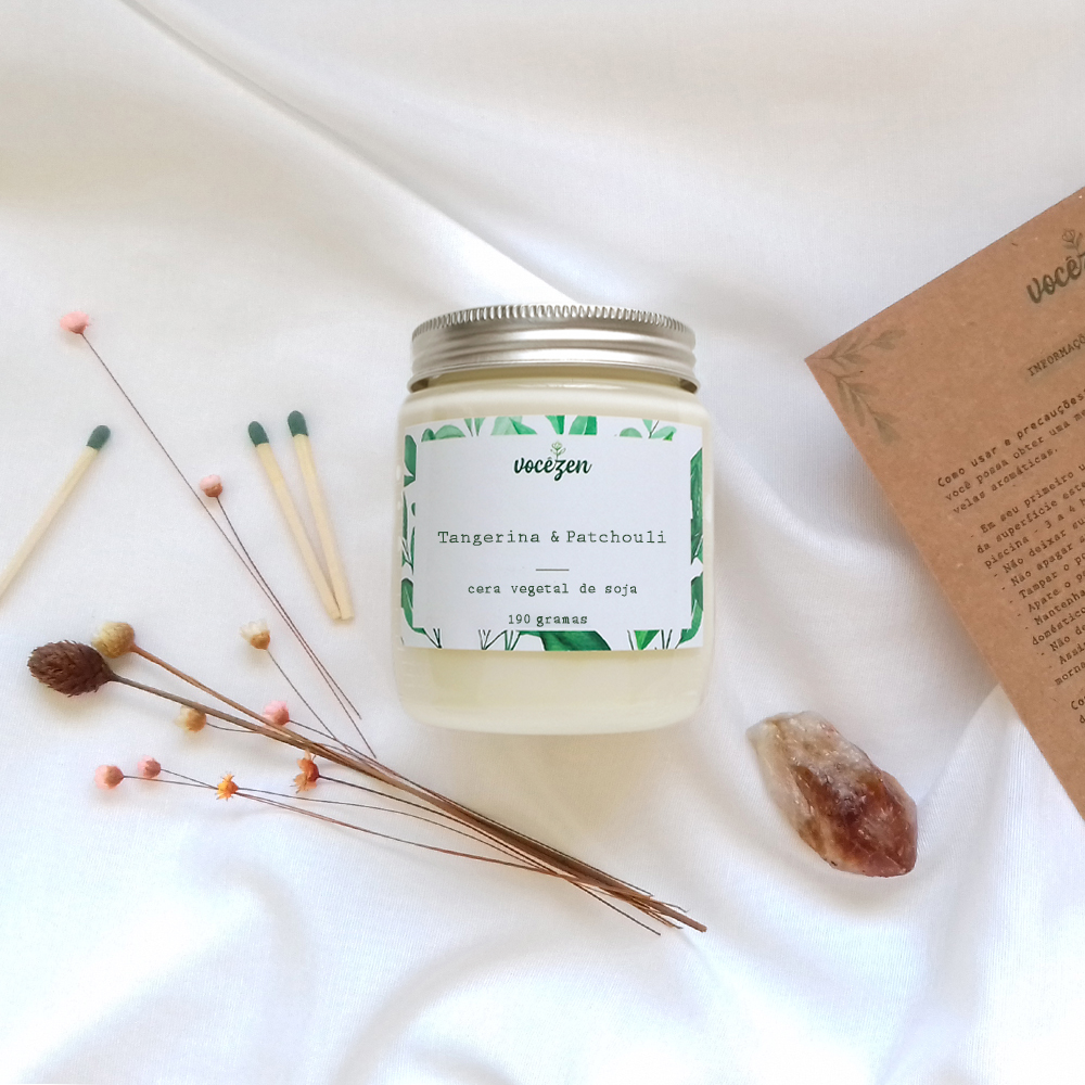 A vela de Tangerina e Patchouli traz alegria e bem-estar.